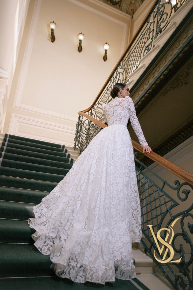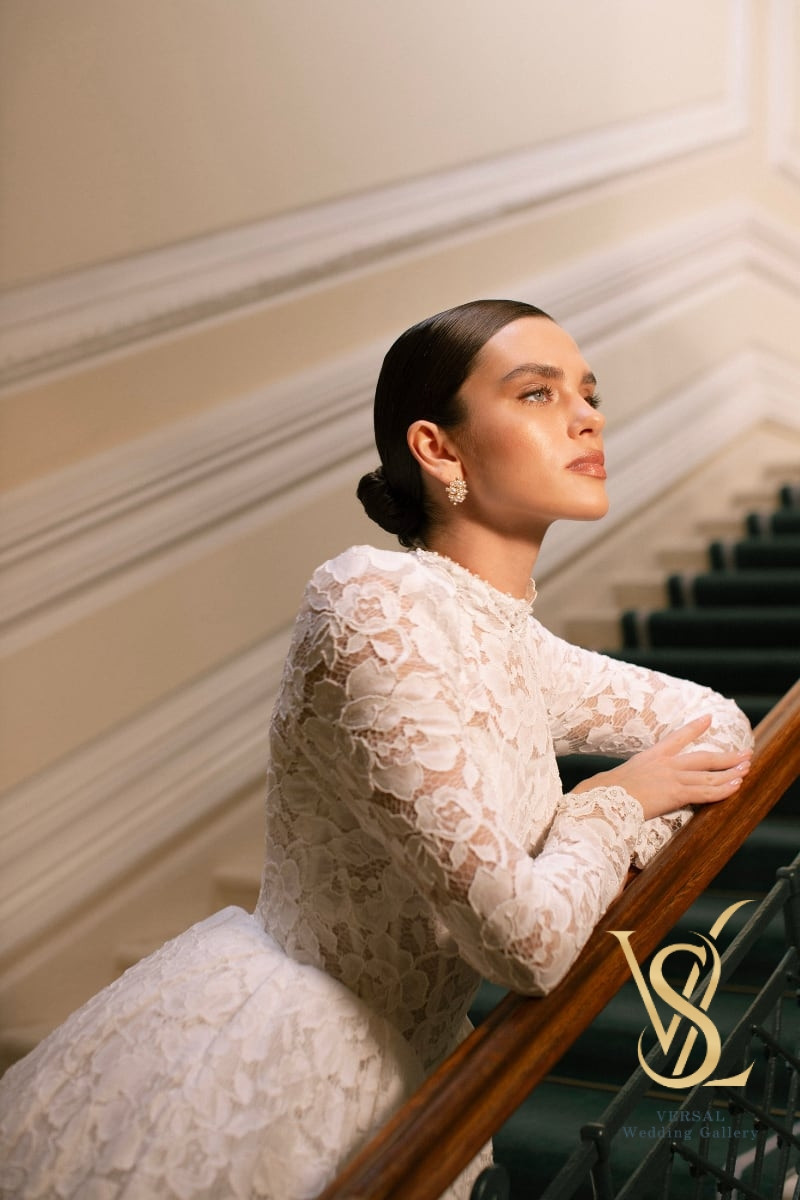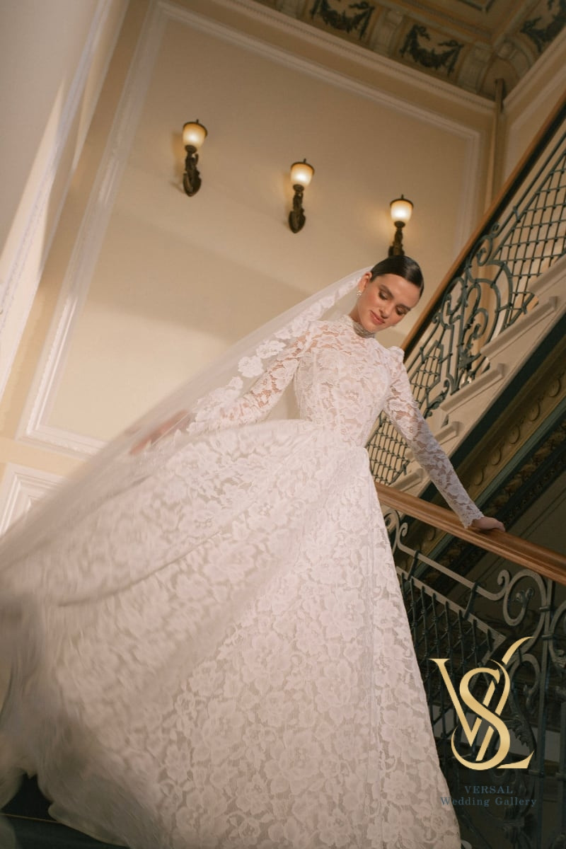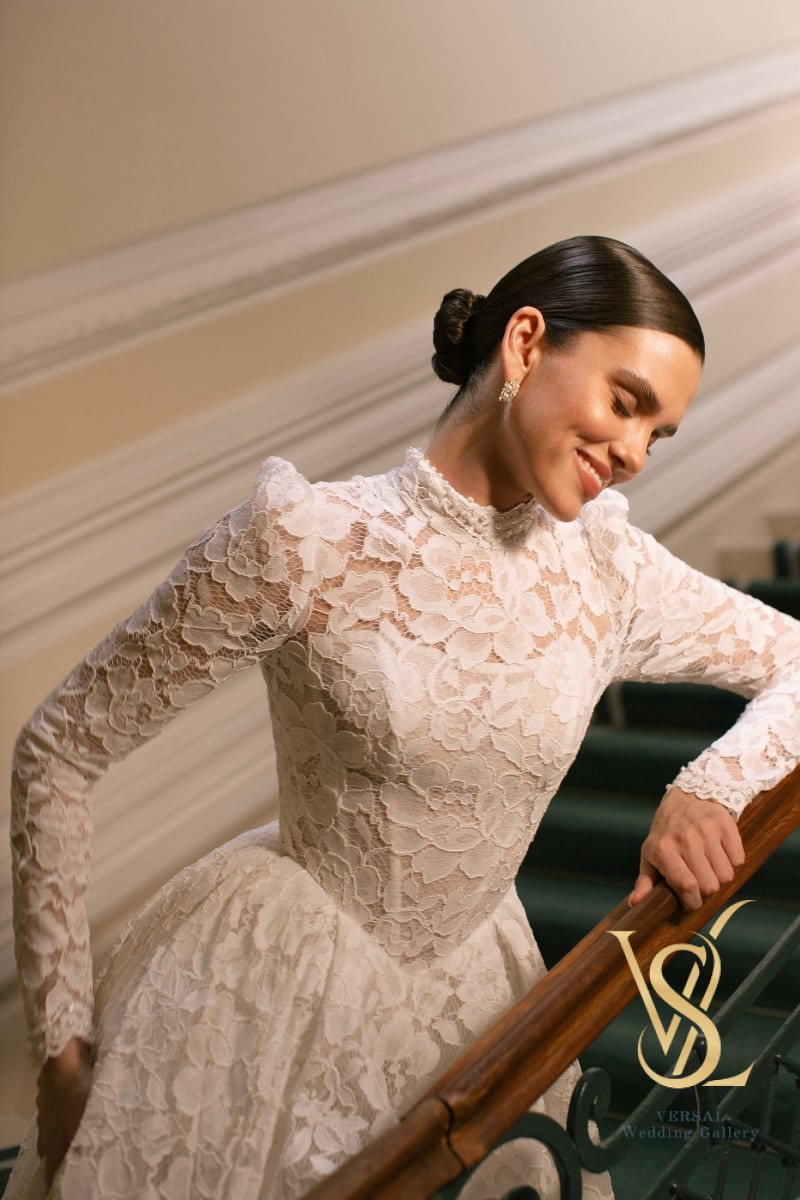 A-line wedding gown with a fitted waist and a layered train skirt. The bodice is crafted with a corset base softened by layers of sheer mesh, overlaid with delicate corded lace. The sculpted waistline in a pointed shape emphasizes the elegance of the silhouette, while the open lace-up back adds a refined touch. Slim lace sleeves with gathered shoulders and a high stand-up collar are embellished with sequins and beads, with scalloped lace edges creating a graceful detail. The full skirt, made of corded lace, mikado, and layers of soft and structured tulle, is gathered into deep pleats at the waist, giving extra volume and a sense of grandeur. Customizable options include a non-sheer corset in ivory or nude shades.