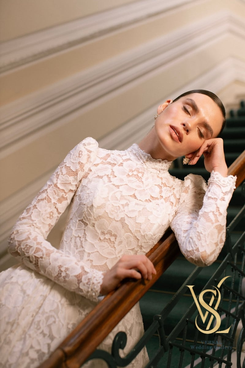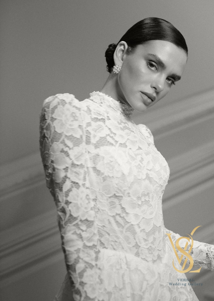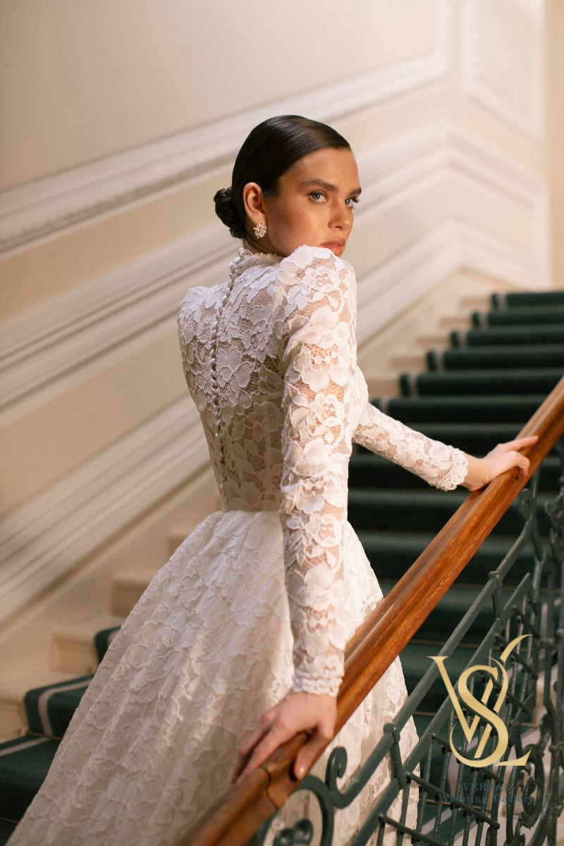 A-line wedding gown with a fitted waist and a layered train skirt. The bodice is crafted with a corset base softened by layers of sheer mesh, overlaid with delicate corded lace. The sculpted waistline in a pointed shape emphasizes the elegance of the silhouette, while the open lace-up back adds a refined touch. Slim lace sleeves with gathered shoulders and a high stand-up collar are embellished with sequins and beads, with scalloped lace edges creating a graceful detail. The full skirt, made of corded lace, mikado, and layers of soft and structured tulle, is gathered into deep pleats at the waist, giving extra volume and a sense of grandeur. Customizable options include a non-sheer corset in ivory or nude shades.