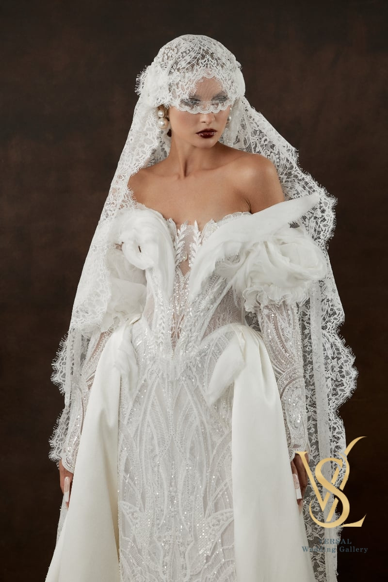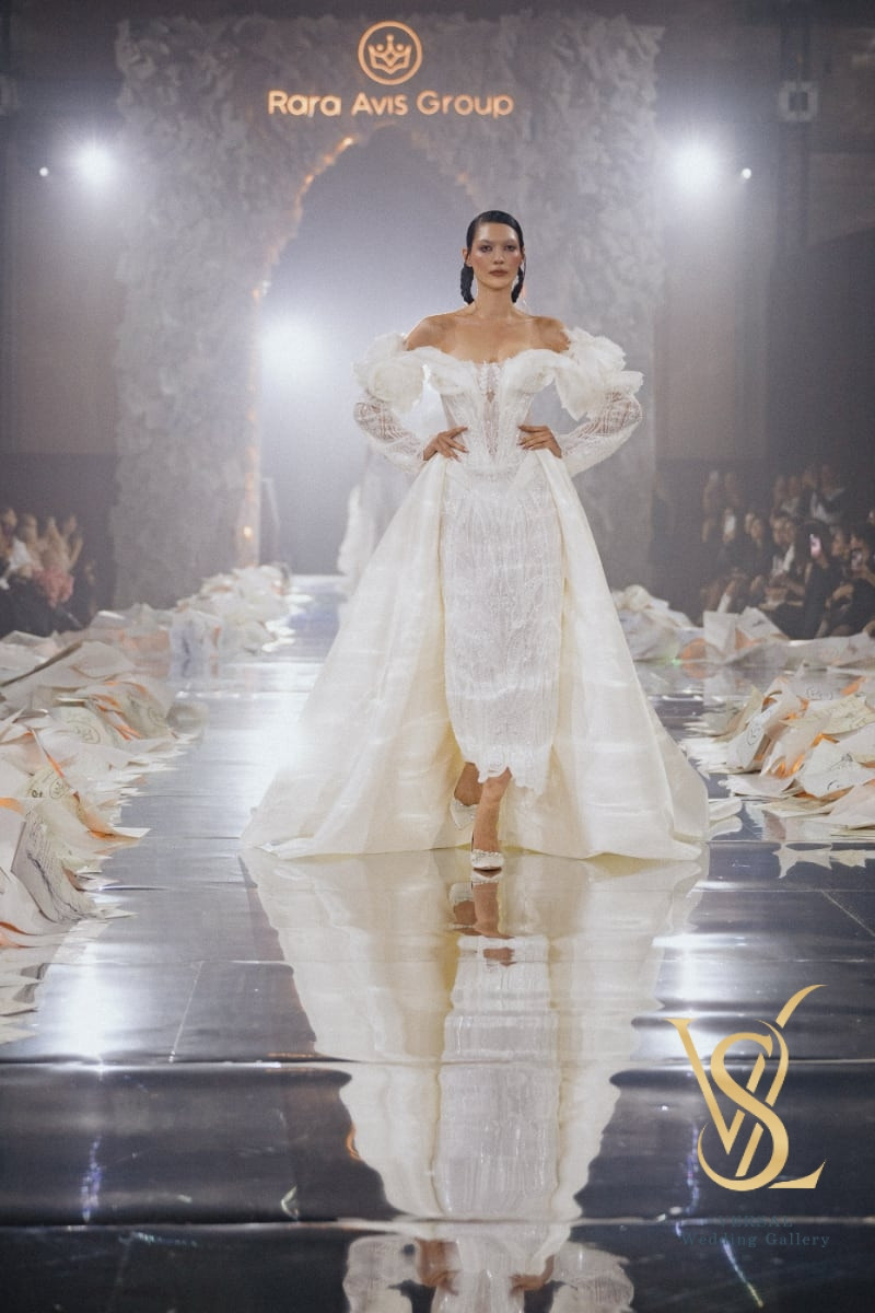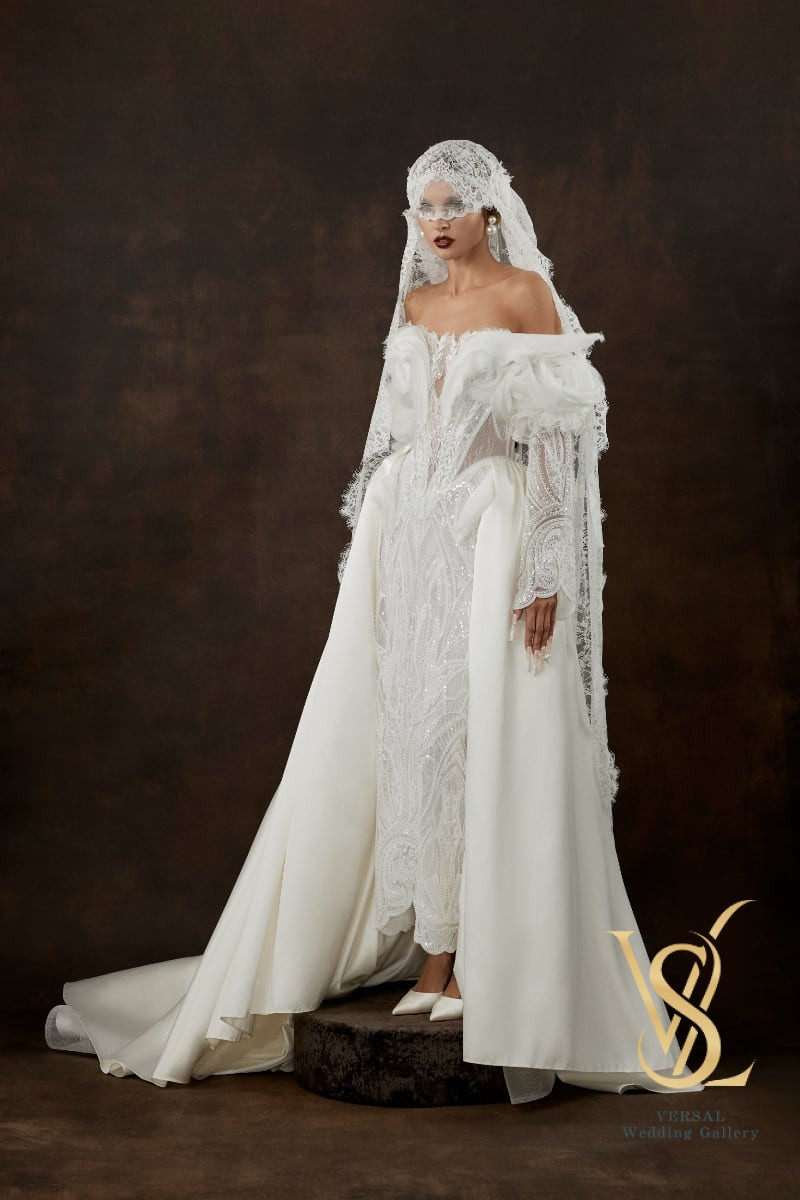 The detachable overskirt adds dramatic volume, while lace-and-silk removable sleeves complete the look with airy softness.