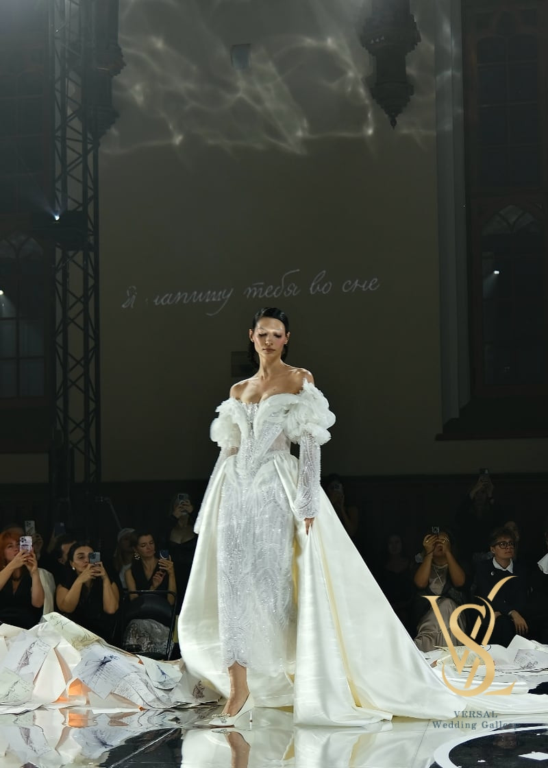 A-line wedding set: a midi dress with detachable sleeves and a voluminous overskirt with a train.