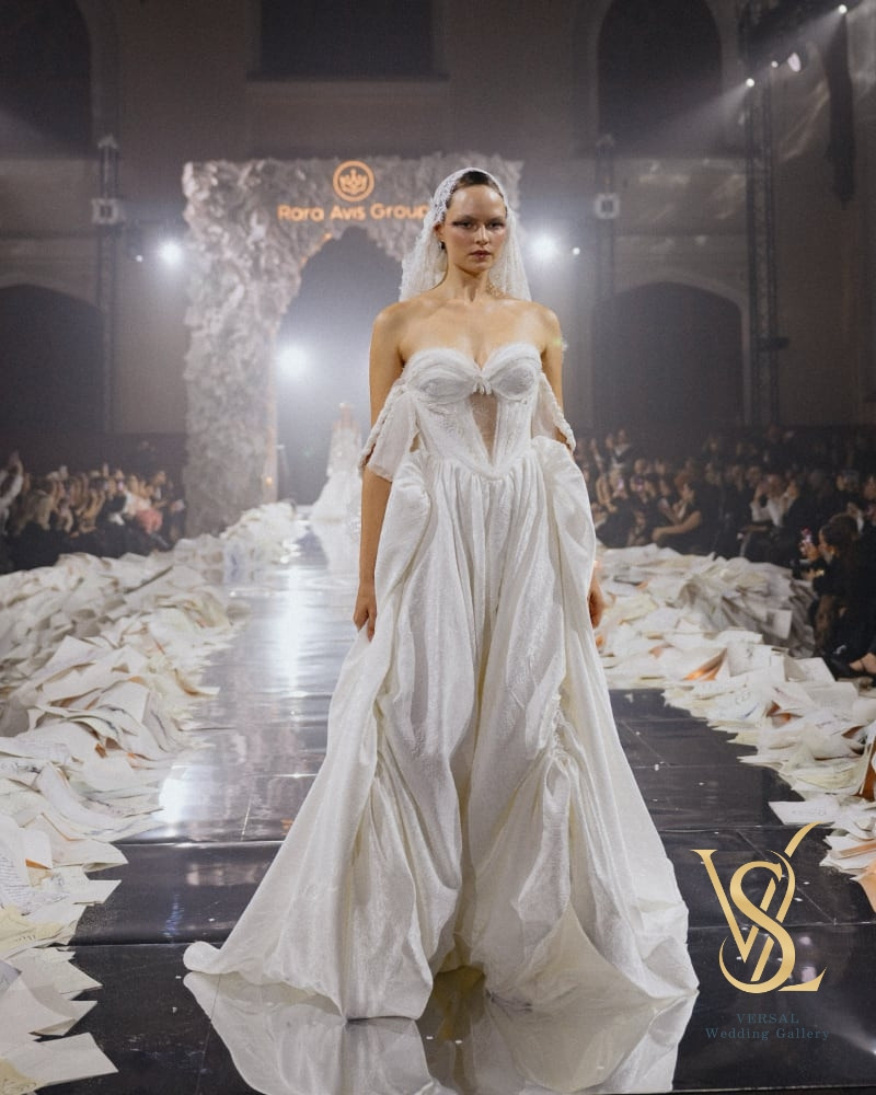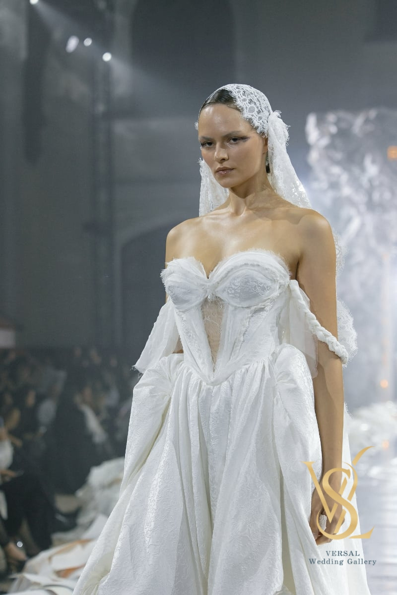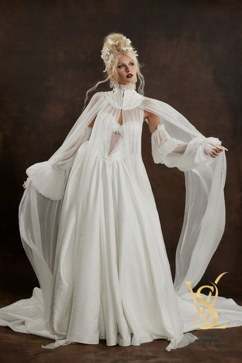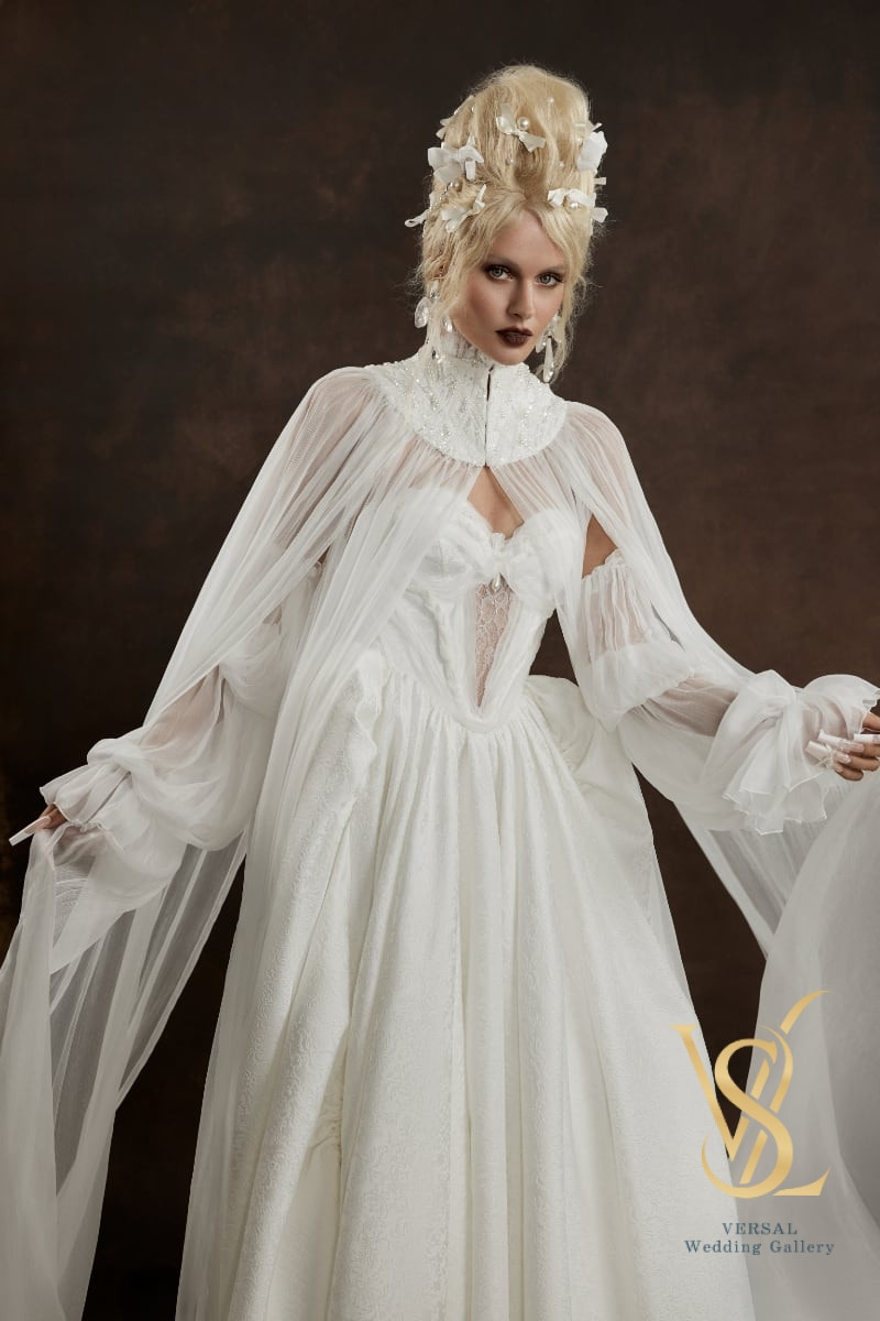 The long skirt with a train and sculpted volume is complemented by an elegant silk cape, creating a perfect balance of softness and regal grace.