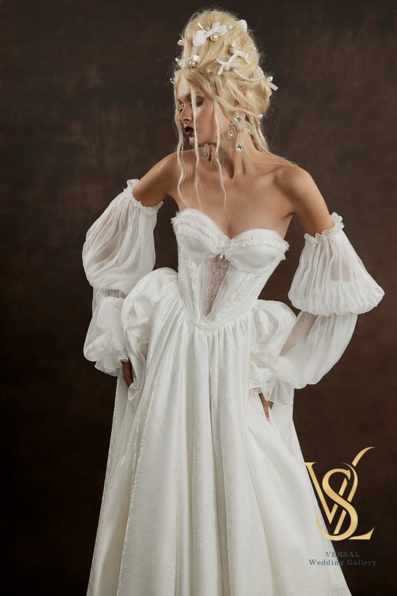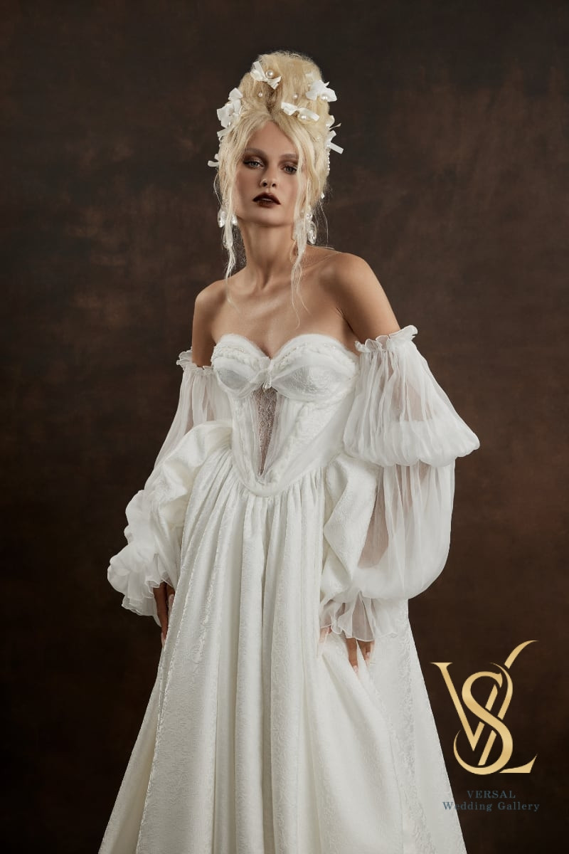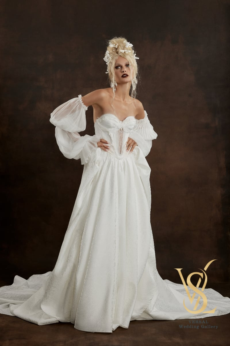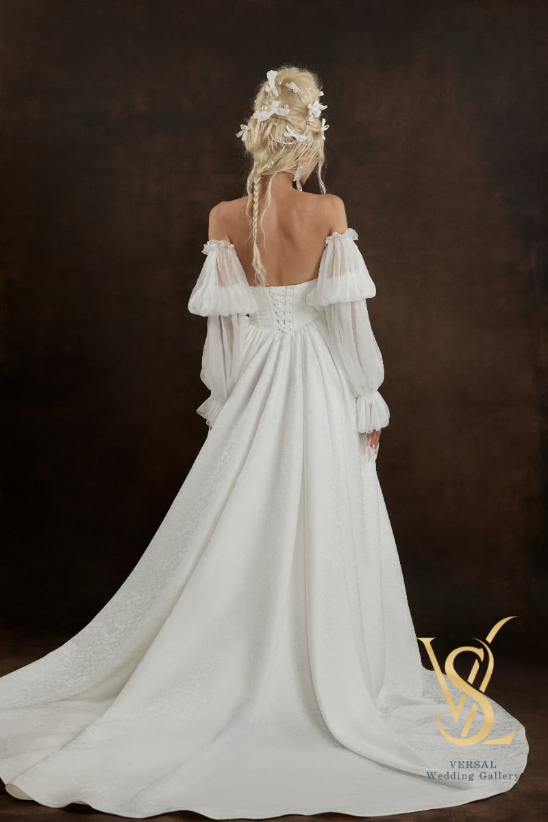 The long skirt with a train and sculpted volume is complemented by an elegant silk cape, creating a perfect balance of softness and regal grace.