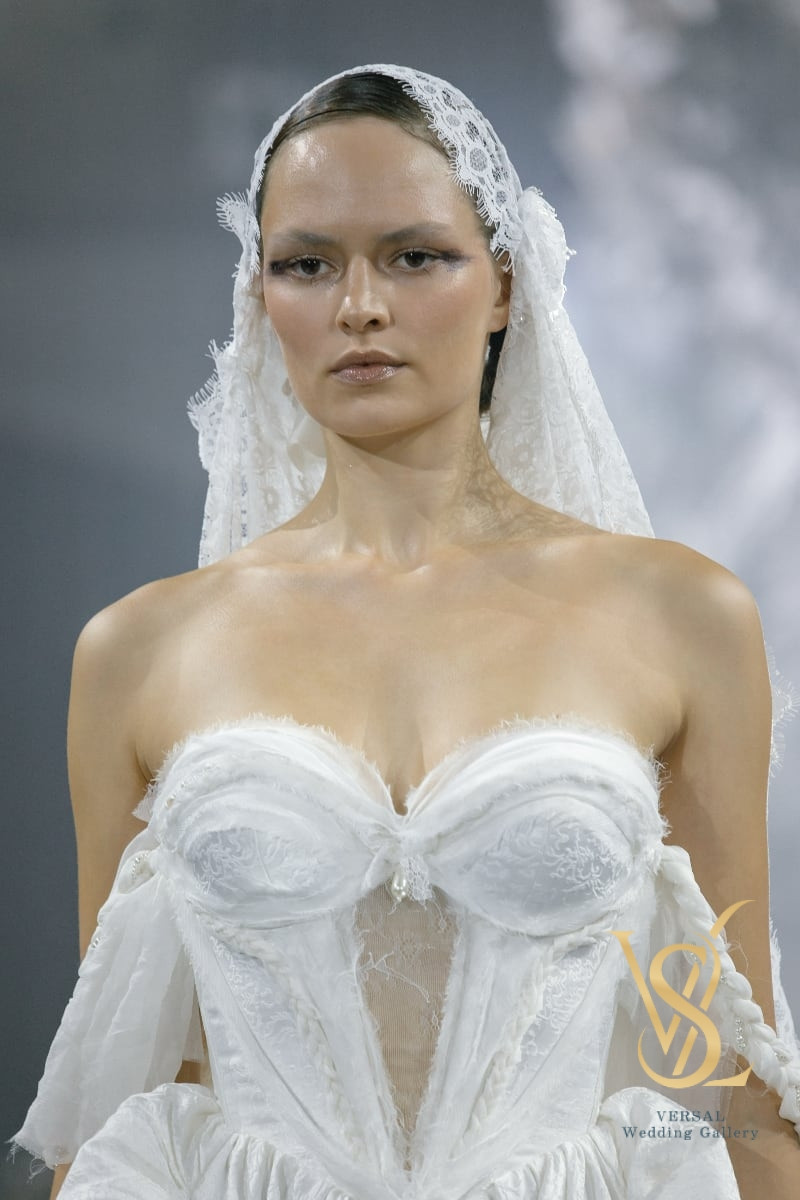 The corset features sculpted seams, built-in cups, silk draping, pearl strands, and delicate braids, with an open lace-up back. Removable silk wing-like braids add lightness.