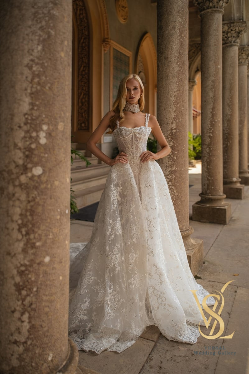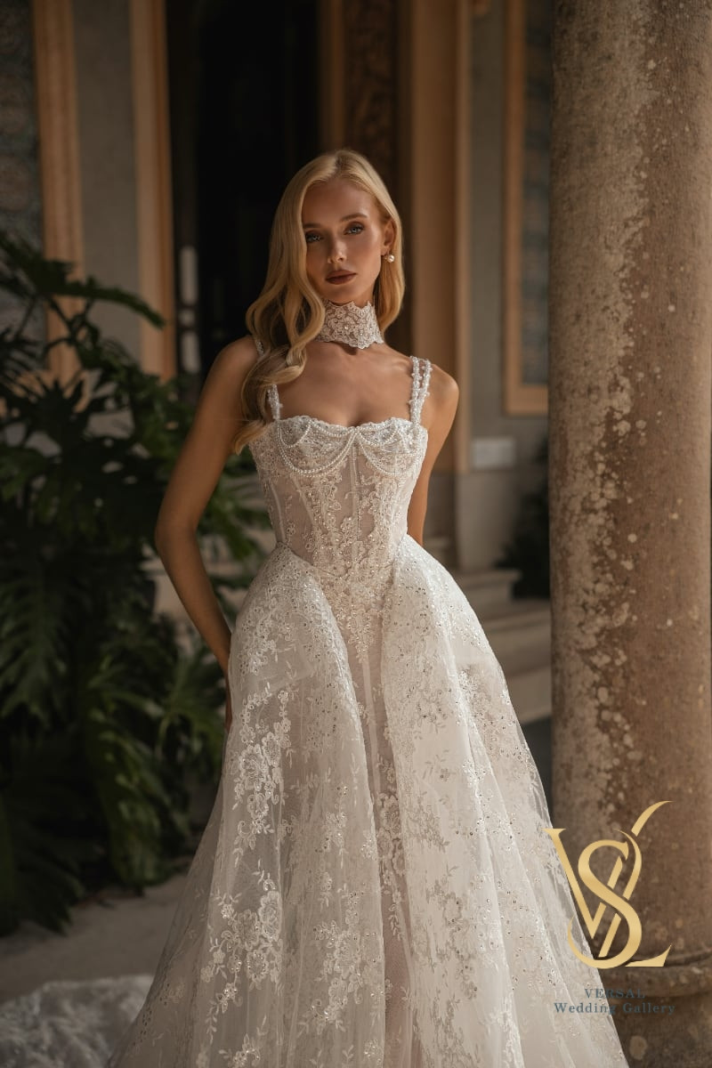 A mermaid-style bridal set with a semi-sheer corset overlaid in sparkling lace. The bodice is adorned with pearls, crystals, and decorative straps connected with beads. The layered tulle and lace skirt with a sweeping train is paired with blush-toned shorts for a daring accent. The look transforms with a detachable overskirt in horsehair-trimmed mesh and sequined lace, as well as a crystal-embellished choker. Customization options: ivory or blush lining; detachable lace wings.