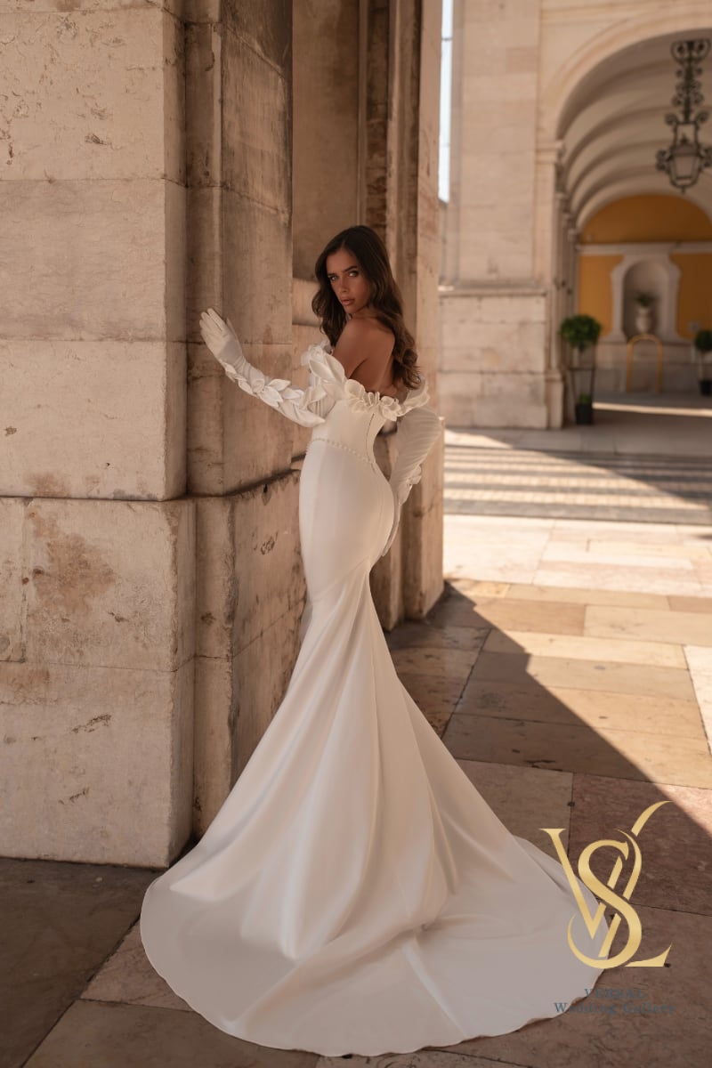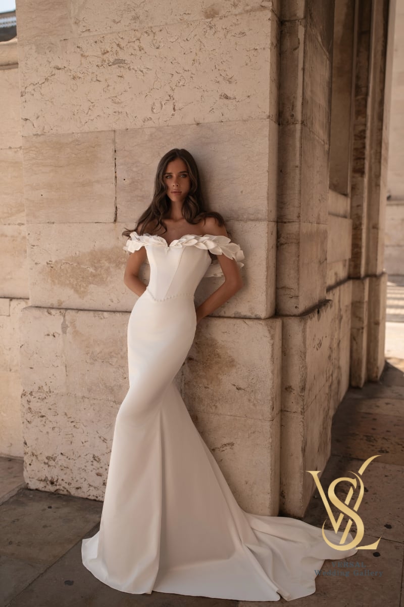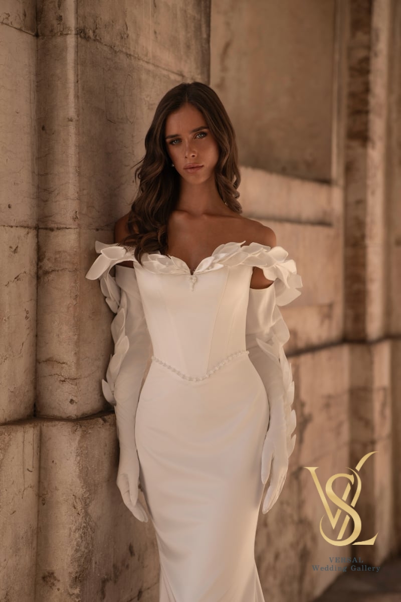 Peplum made of crinkled crash fabric with a wrinkled texture. Lush tiers and flexible boning create perfect volume, while a soft drawstring ties beautifully and adjusts at the waist. A mermaid-style wedding dress in luxurious milky satin with a soft noble sheen. The sensual corset has a neckline, wide straps with voluminous petal decor, and a sparkling scatter of beads. A handmade belt accents the waist and adds festive elegance. The fitted dense satin skirt gracefully flares from the knees and flows into a train.