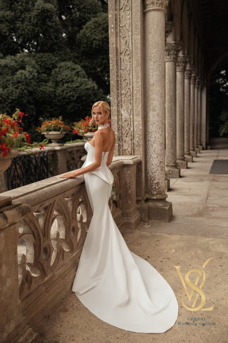 A bridal ensemble featuring an elongated corset and an A-line skirt. The structured corset with fitted cups and a peplum is richly embellished with beads, pearls, and crystals, while the open lace-up back adds a refined touch. The satin skirt with a sweeping train and a slit on the left leg is layered with tulle and netting for added volume, creating a light yet dramatic silhouette. The waistline is finished with a lace-up belt. Customization options: inner lace-up back, undecorated corset, detachable wings, or fabric substitution in lemon-toned mikado.