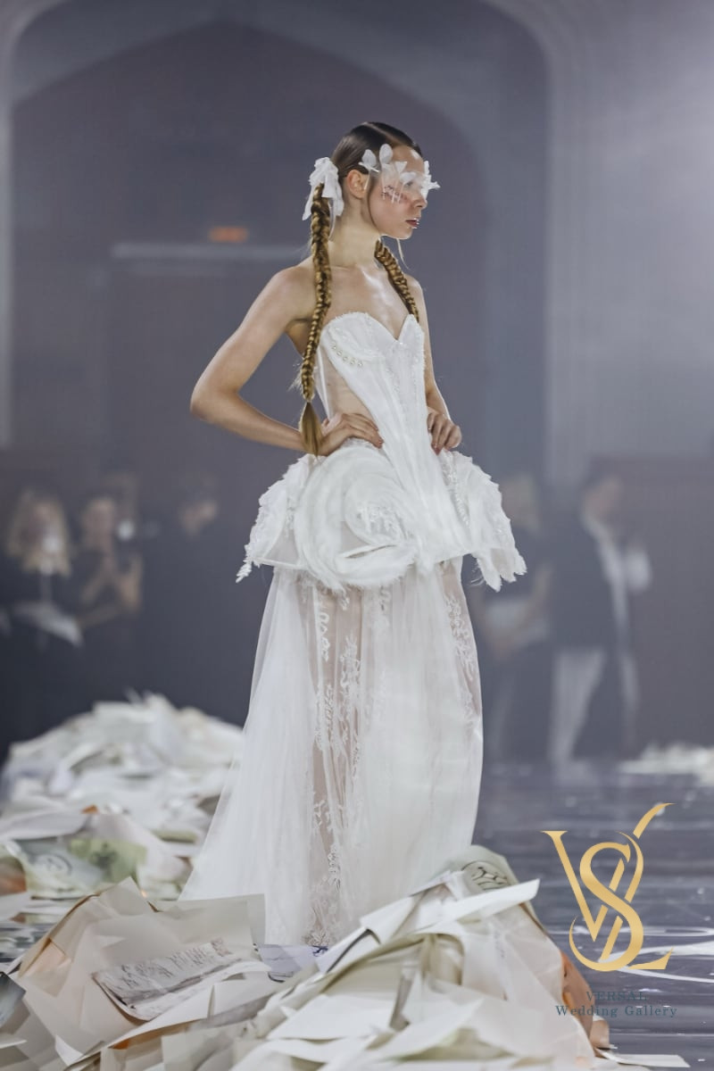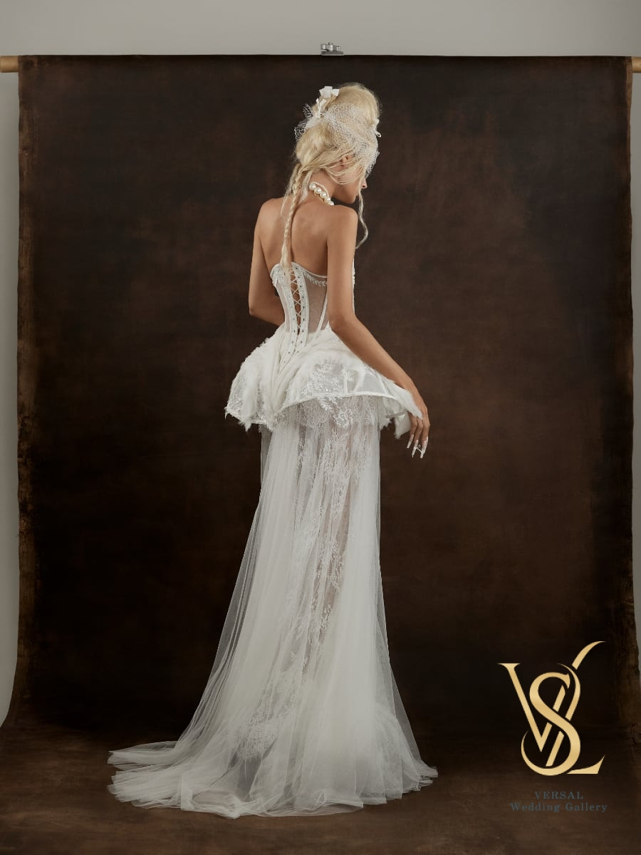The transparent overskirt is long with a train, gathered at the waist, combining delicate Chantilly lace underneath and weightless tulle on top.
