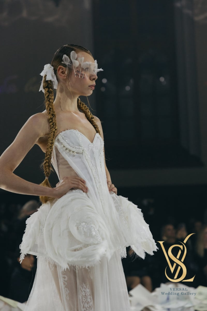 Wedding set: a structured mini dress paired with a sheer A-line overskirt — two looks in one.