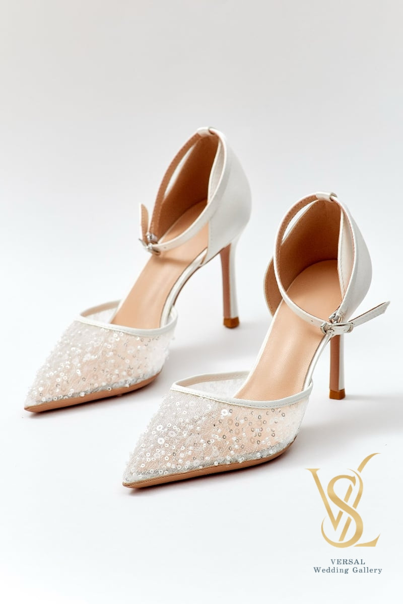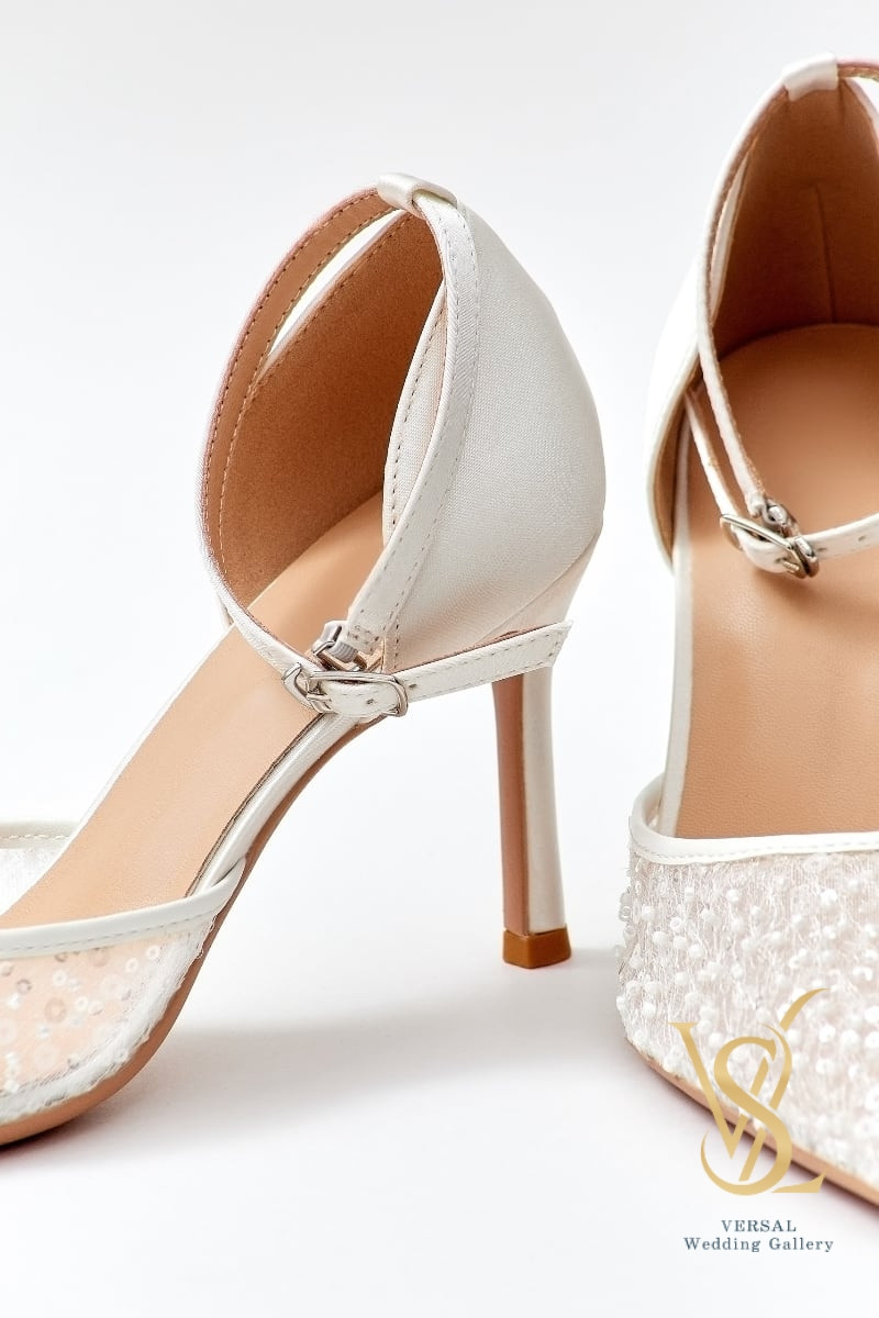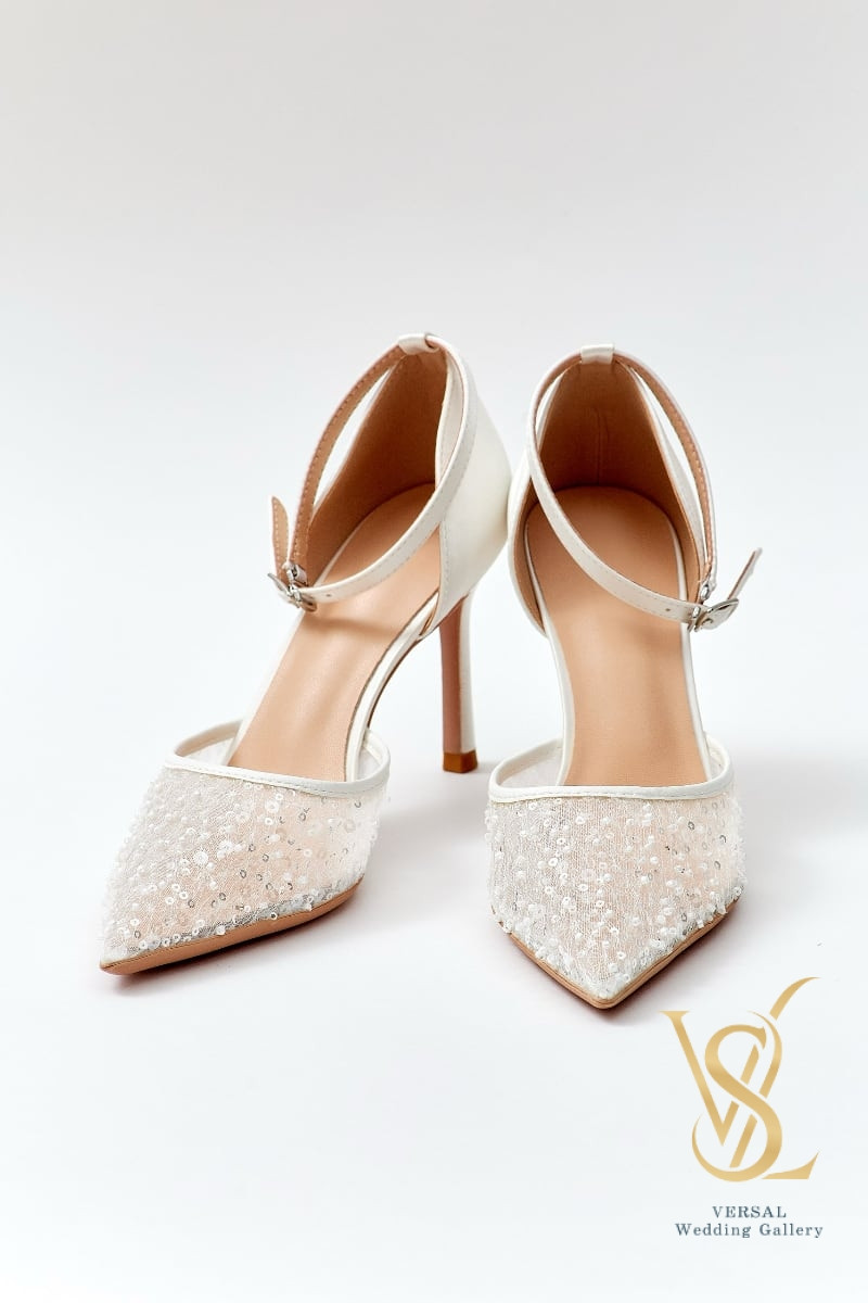 Shoes with an adjustable ankle clasp for additional support. The toe of the shoes is made of transparent material, decorated with sequins, beads and cobwebs. The heel is closed and covered with satin fabric.
