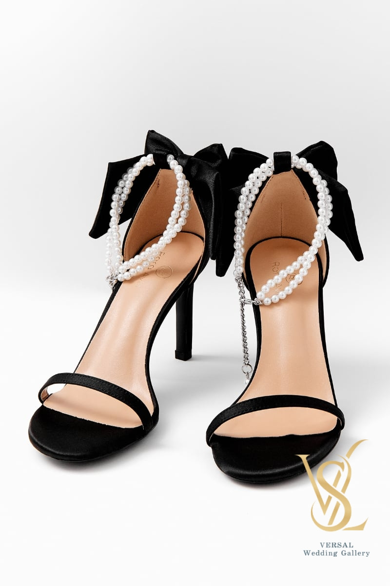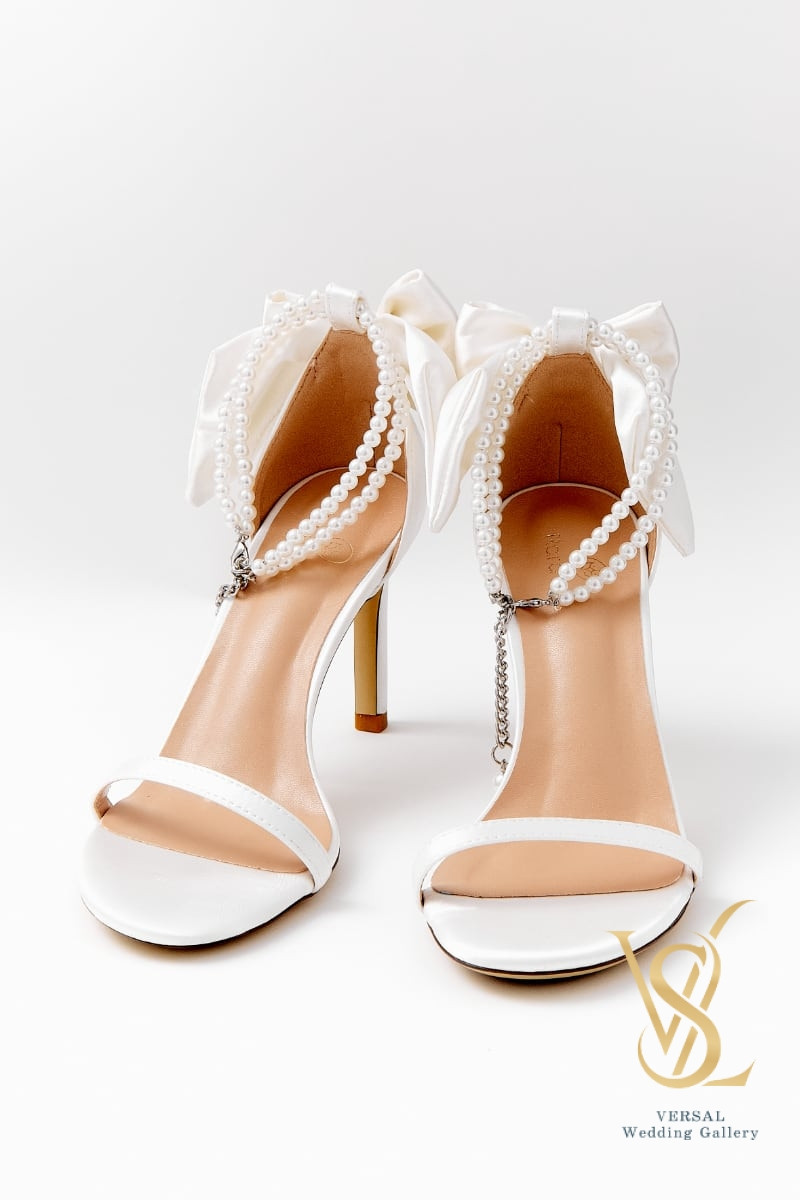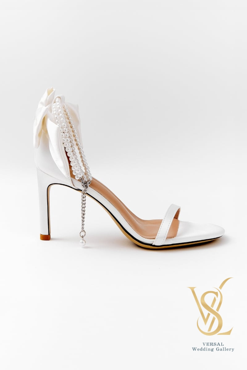 High-heeled sandals. The heel is decorated with a voluminous satin bow in the color of the main material. The sandals are fixed on the foot thanks to pearl threads that fasten around the ankle. The sandals are available in two colors: white and black.