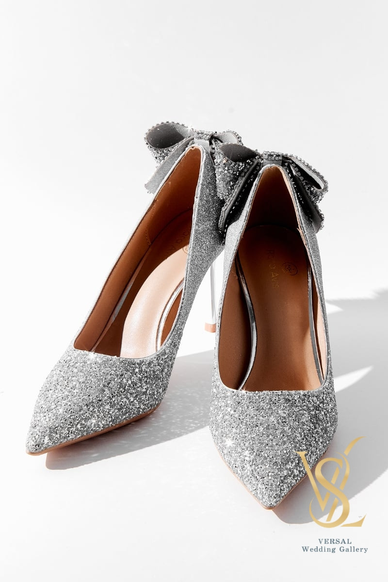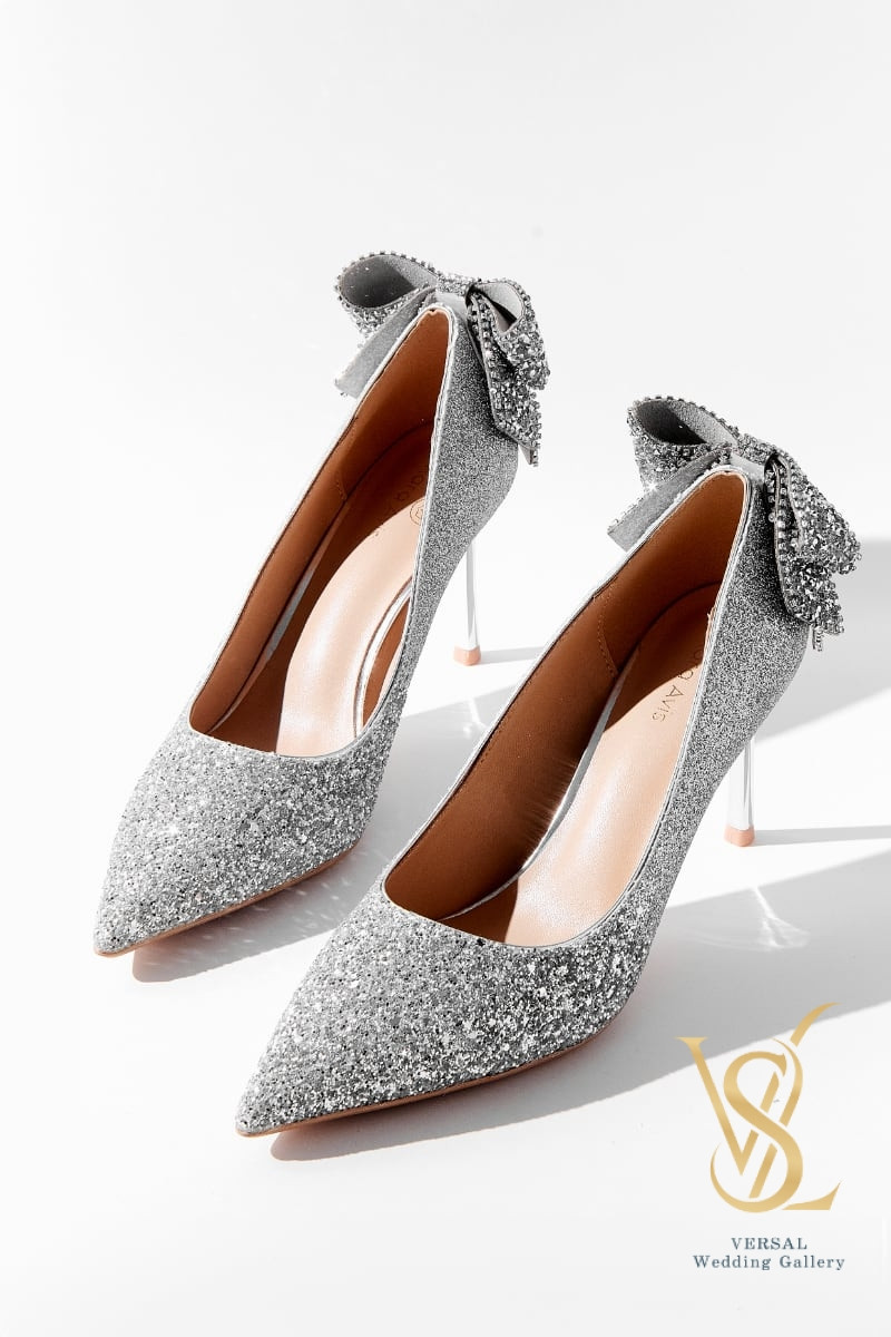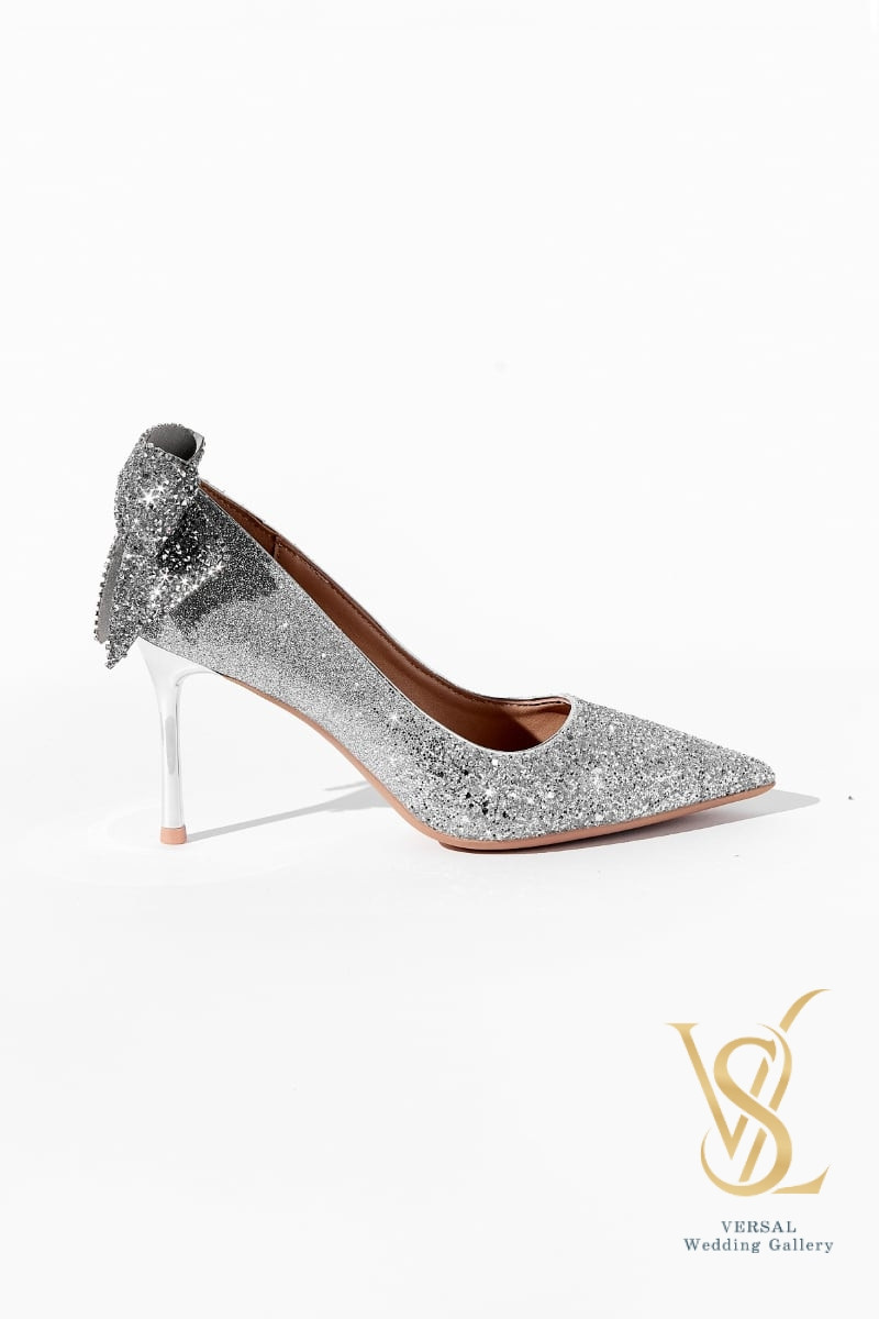 Sparkling silver pumps. The heel is decorated with a large bow in the color of the main material of the shoes. The heel with a mirror effect harmoniously matches the shiny top.