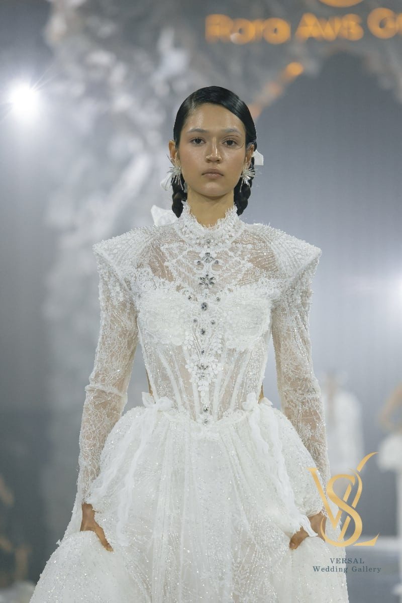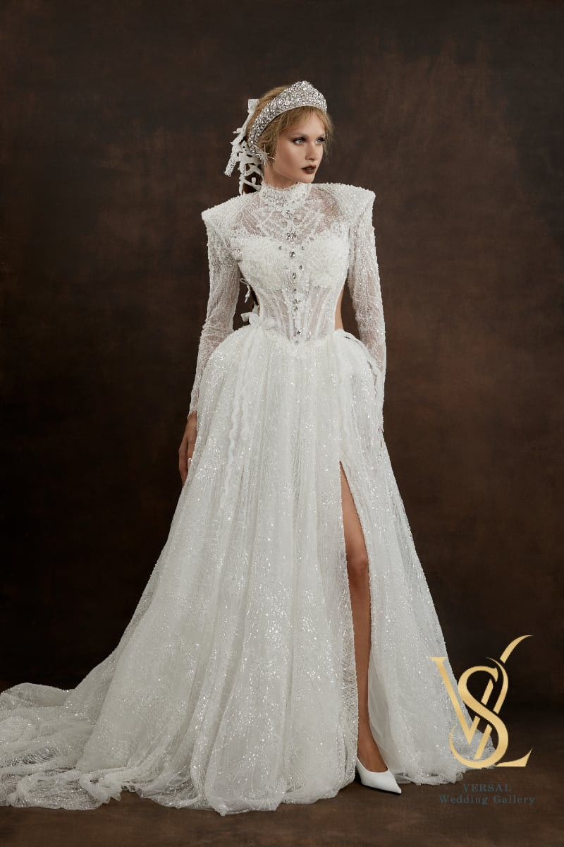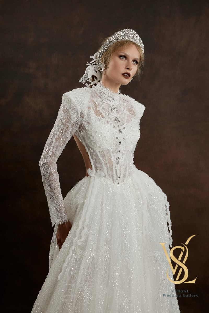 The structured corset with molded cups is paired with a lace bodice featuring a high stand collar, sharp shoulders, and long fitted sleeves with pearl buttons, richly embroidered with beads, pearls, and crystals.
