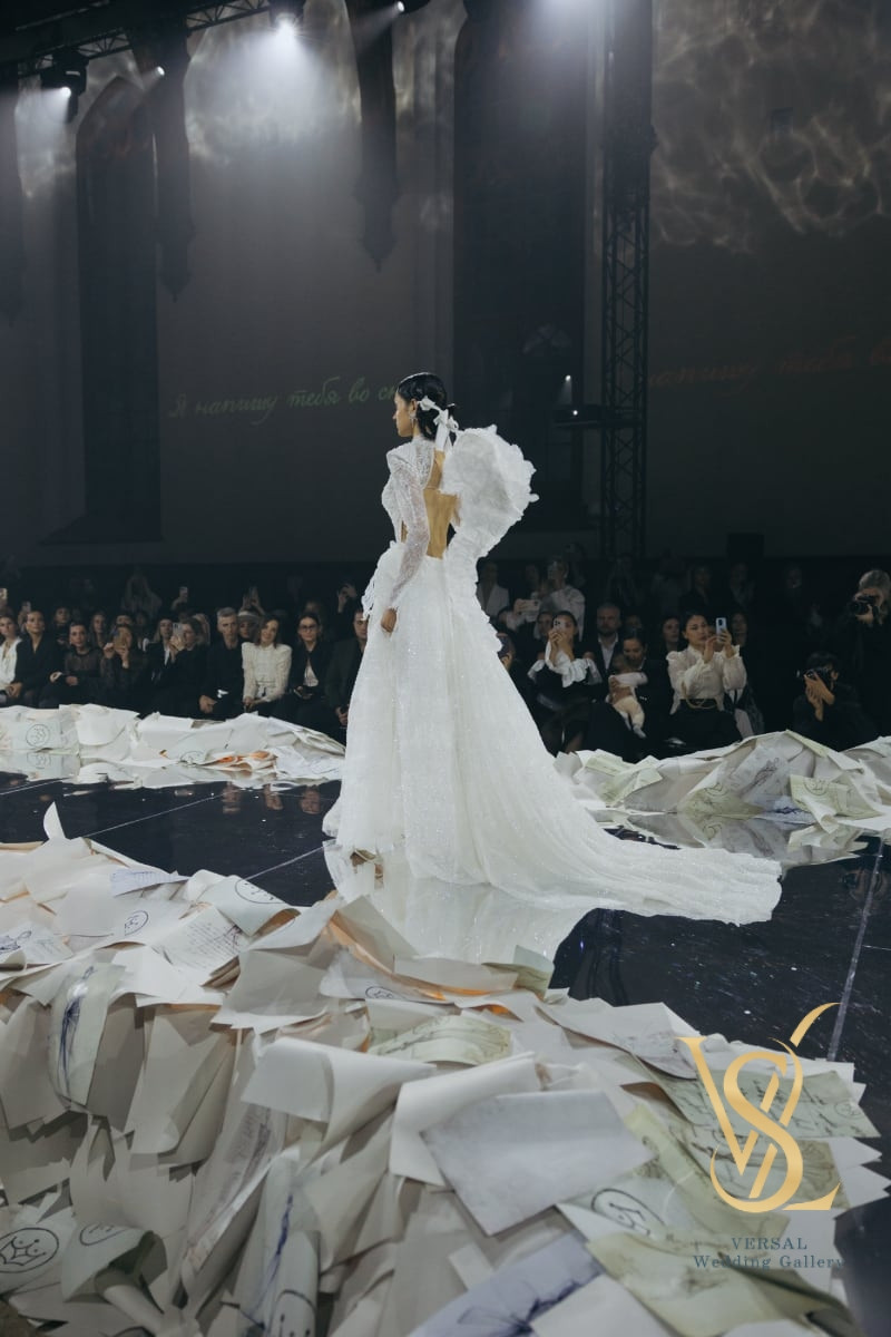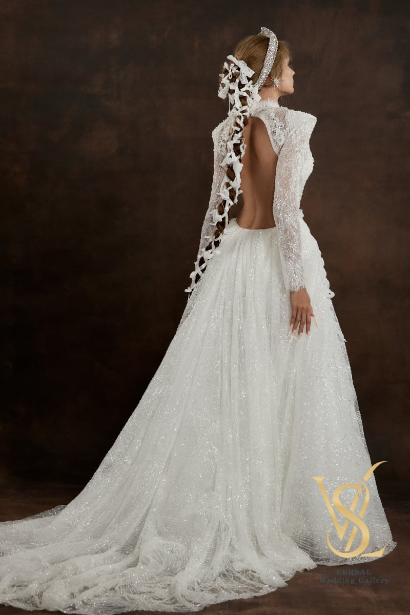 A-line wedding dress with an elegant corset and a flowing skirt with a train.