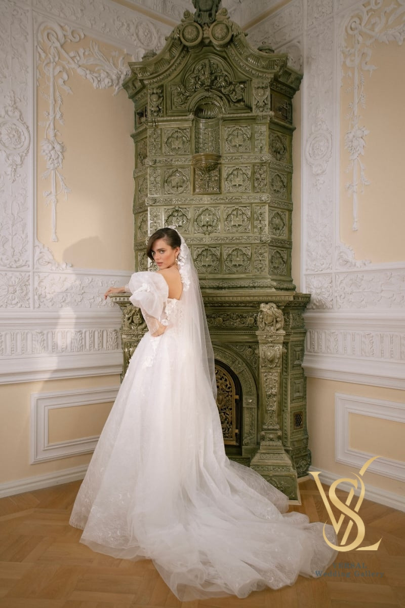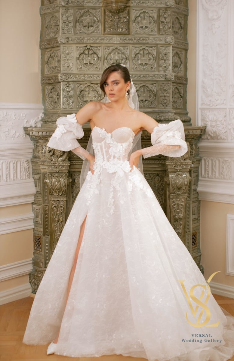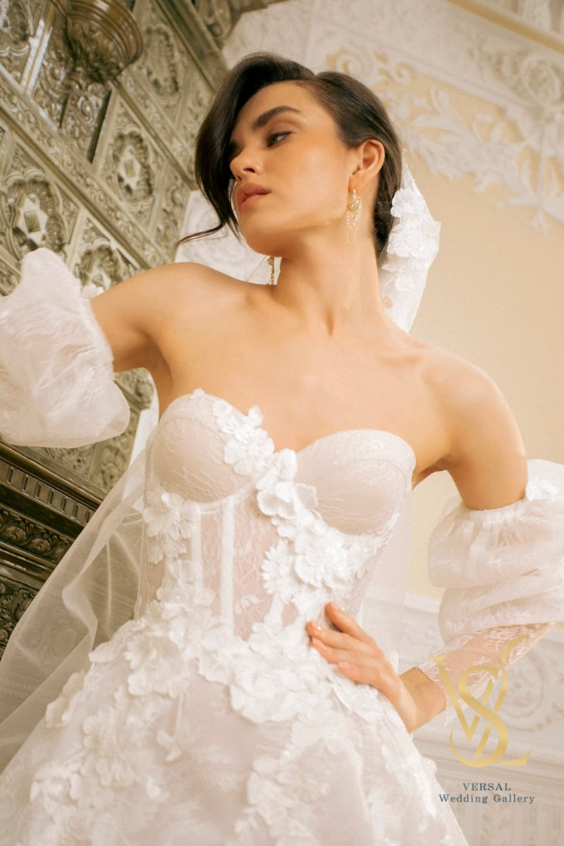 A princess-style wedding gown with a structured corset and a flowing multi-layered train. The bodice features almond-shaped cups and a pointed waistline with a V-shaped nude mesh insert. The seams are outlined with ivory piping, while diagonal draping in delicate nylon adds movement and refinement. Lace appliqués with 3D flowers and light feathers highlight the neckline, the central insert, and the open lace-up back. The voluminous skirt is crafted from multiple layers, including shimmering tulle, and flows into a long train. A side slit on the right adds lightness and allure, while the top layer is adorned with lace motifs, 3D florals, and clusters of feathers for a textured, ethereal effect. The look can be transformed with voluminous draped straps, attached to the corset with buttons. Customization options: opaque corset; modesty panel for the back lace-up.